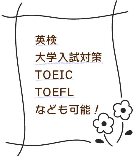 中学、高校の授業の内容はもちろん、大学入試、英検、TOEIC、TOEFLの対策もできます。一人一人の長所を活かし、英語が楽しく学べるよう工夫しています。話す、聞く、書く、読むをバランスよく取り入れ、英語に慣れることを目指します。